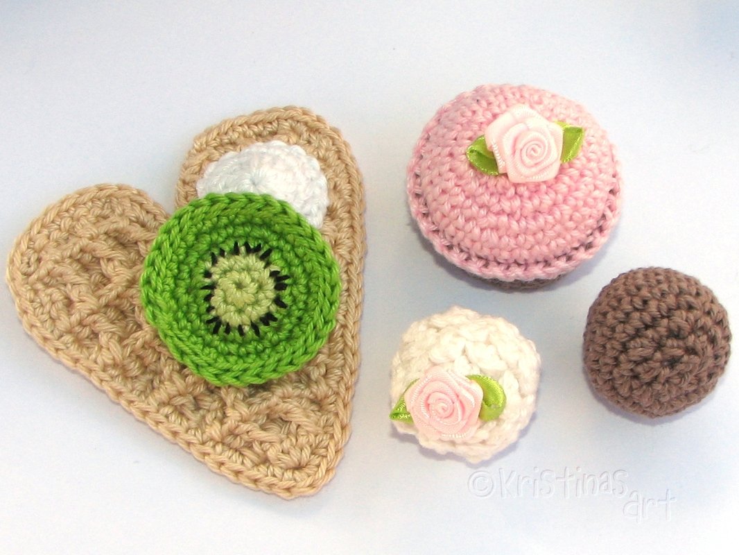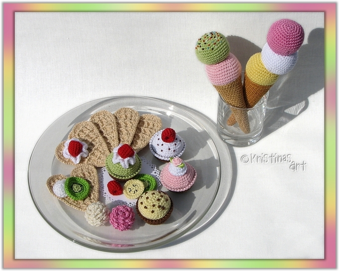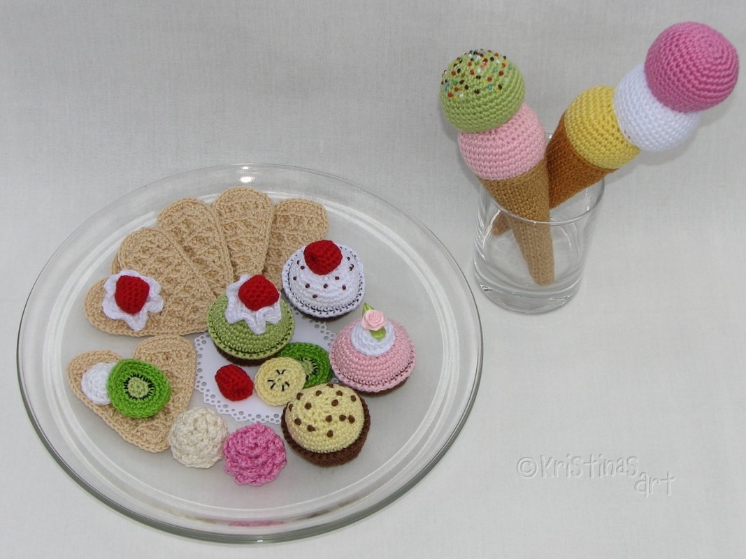 Mit dieser ausführlich bebilderten Häkelanleitung kannst du alle Köstlichkeiten nachhäkeln und miteinander kombinieren. Herzwaffeln, Eis, Törtchen, Trüffel, Obst und Sahnedeko, all das ist im detailliert bebilderten Ebook enthalten.