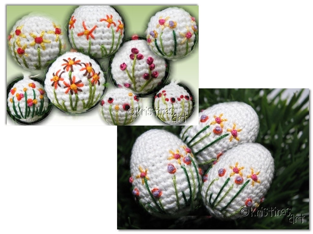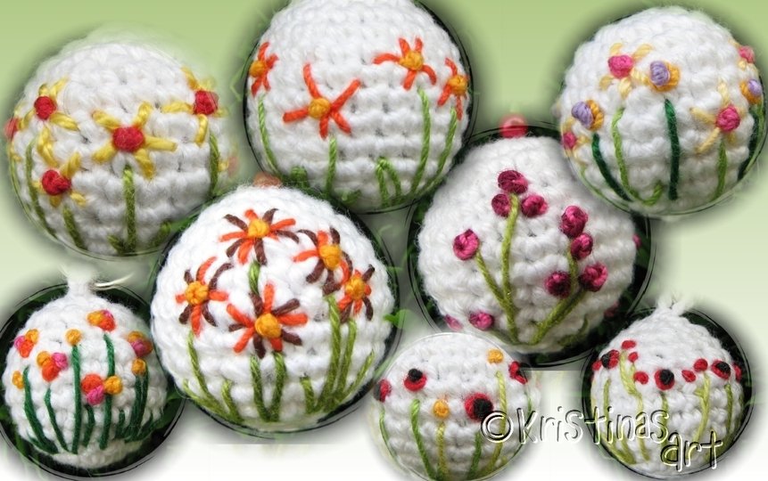 Häkel doch mal ein paar Kugeln oder Eier und verziere sie ganz individuell mit vielen verschiedenen Blümchen.