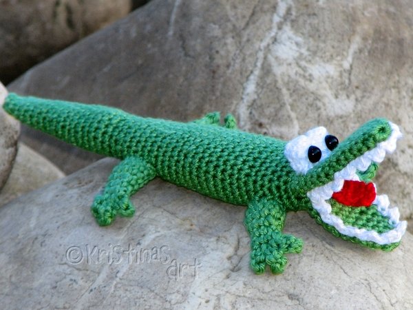 Bei Verwendung von Baumwollgarn mit einer Lauflänge von 125m/50g (z.b. Catania) und einer Häkelnadel Stärke 2 wird das Krokodil 20 cm lang.