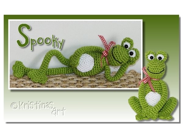 Bei Verwendung von Baumwollgarn mit einer Lauflänge von 125m/50g und einer Häkelnadel Stärke 2 wird der Frosch ca. 19cm groß.