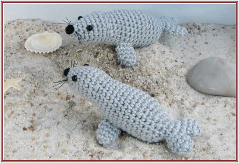 Bei Verwendung von Baumwollgarn mit einer Lauflänge von 125m/50g und einer Häkelnadel Stärke 2 wird der Leuchtturm ca. 15 cm hoch, der Seehund wird ca. 9 cm lang.