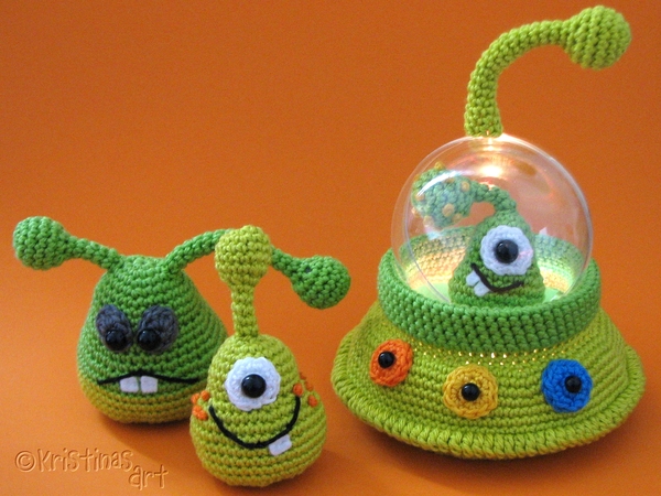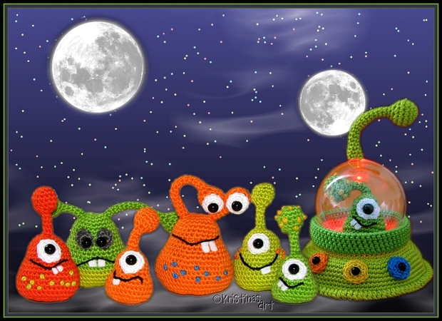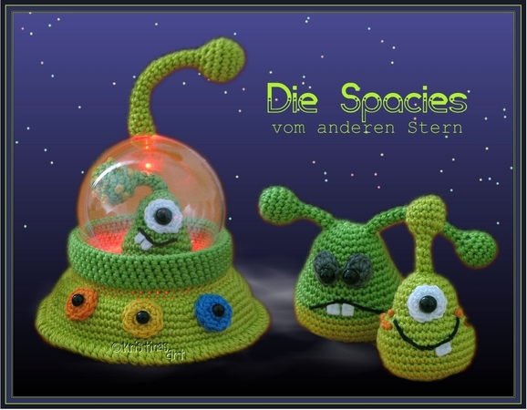 Wenn sie auch bei dir landen sollen, kannst du viele bunte Spacies und Raumschiffe mit dieser detailliert bebilderten Häkelanleitung häkeln. Das Ufo kannst du über ein batteriebetriebenes Teelicht stellen, damit scheint das Licht durch die Kuppel des Ufo´s.