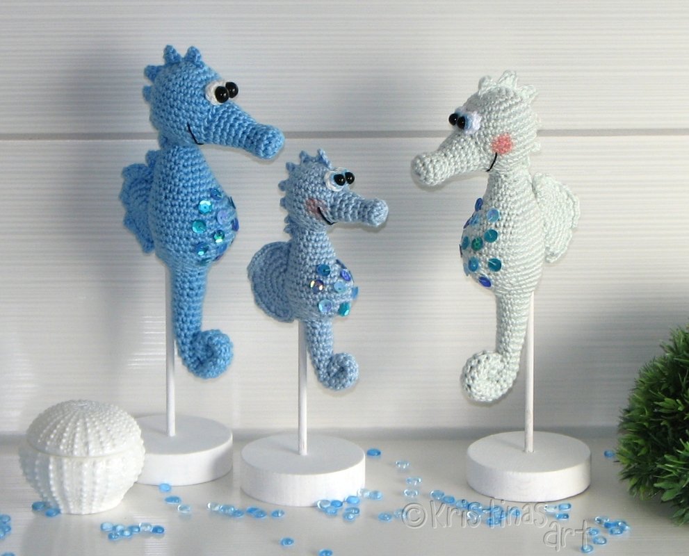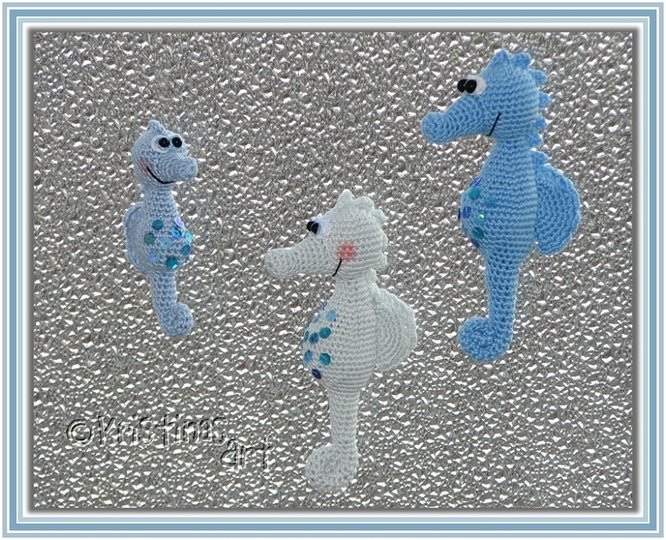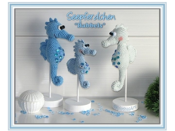 Diese wasserscheuen Seepferdchen kannst du mit dieser detailliert bebilderten, 16-seitigen Anleitung selber häkeln.