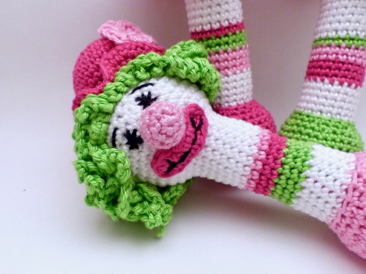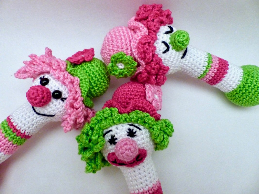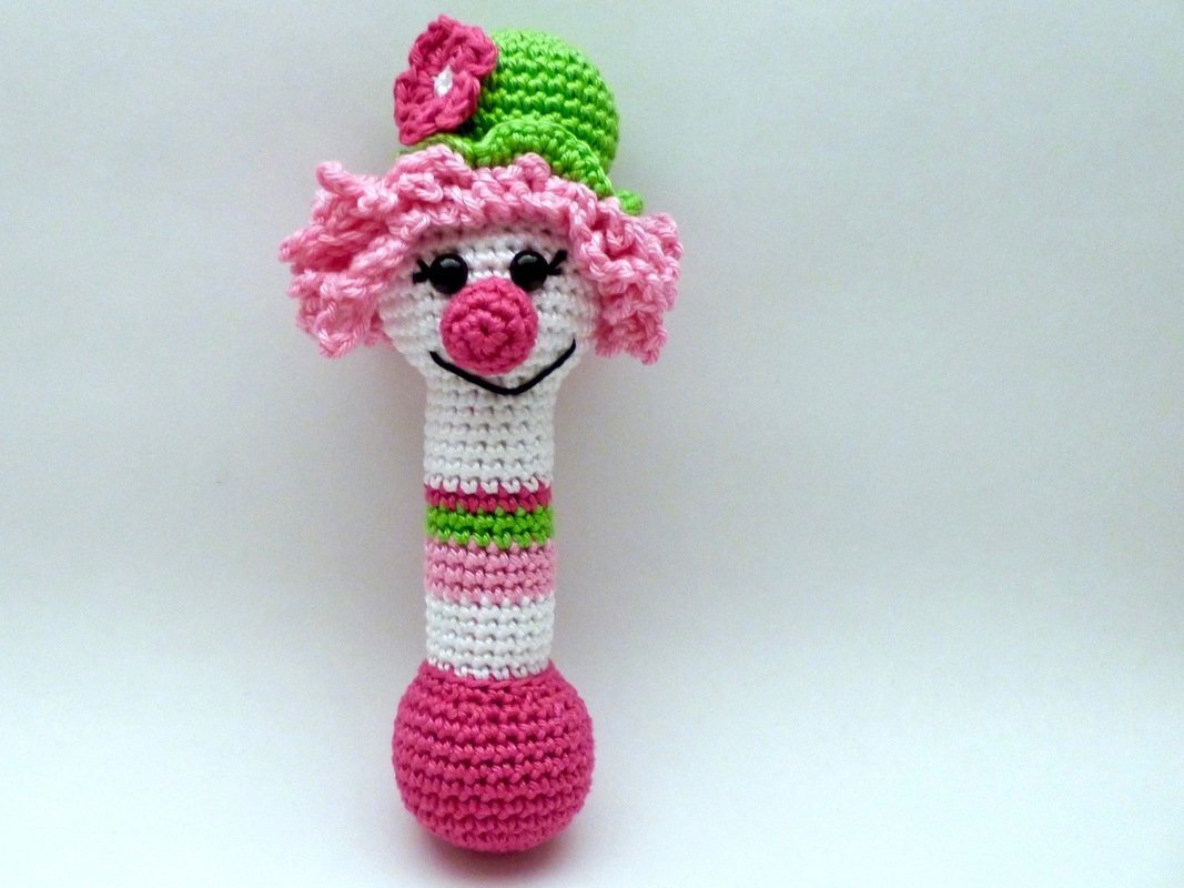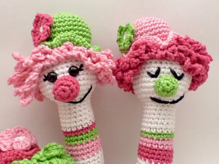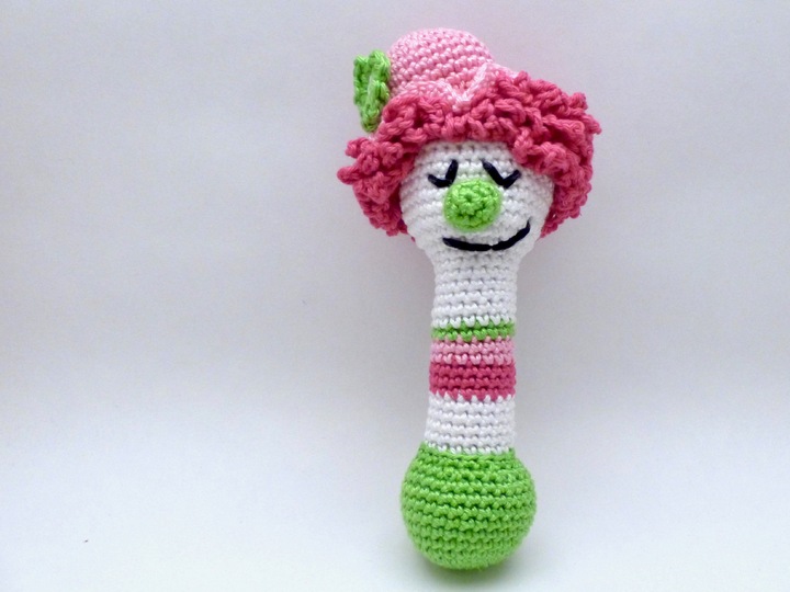 Clown Pippa ist das neueste Mitglied im Ensemble der Greiflinge und Stabrasseln und kommt im sommerlichen Look daher. Mit eingearbeiteter Rassel und den krausen Haaren bietet diese kleine Dame sowohl akustische als auch haptische Erlebnisse für kleine Zirkusfreunde. Ihr könnt damit jungen Eltern eine Freude machen oder selbst für euer Kind eine Rassel häkeln - vom Motiv her geschlechtsneutral können bloß noch die Farben angepasst werden. Eurer Kreativität sind keine Grenzen gesetzt, bzw. könnt ihr auch wunderbar Wollreste verarbeiten.