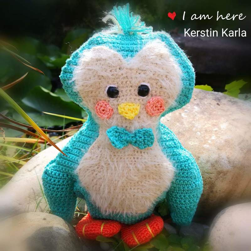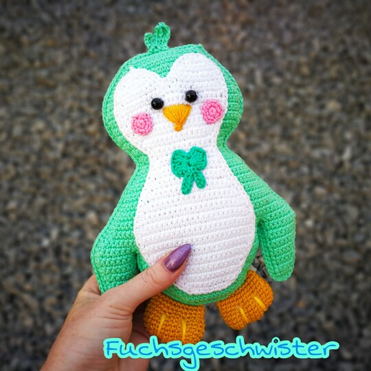 Garn: du brauchst ca. 100 g Hauptfarbe für den Grundkörper, 50g Kontrastfarbe 1 für den Bauch und das Gesicht, Kontrastfarbe 2 für die Schleife (Reste), Kontrastfarbe 3 für die Bäckchen (Reste), Kontrastfarbe 4 für die Füße und den Schnabel.