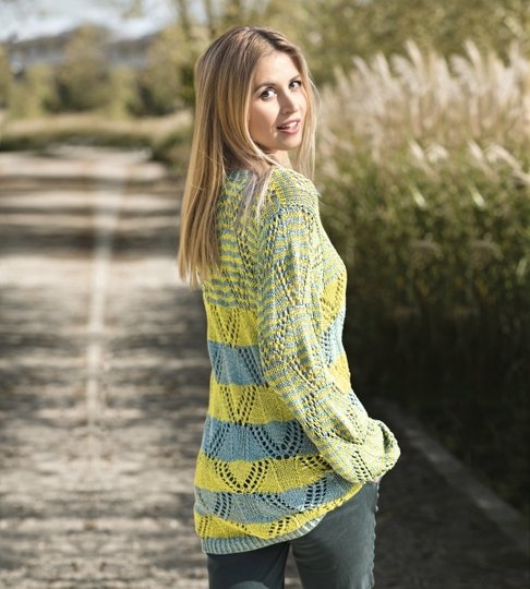 Mal breit, mal schmal: Das Streifendesign dieses locker fallenden Pullis aus Seidenbändchen verleiht dem großzügigen Ajour-muster die reizvolle Optik.