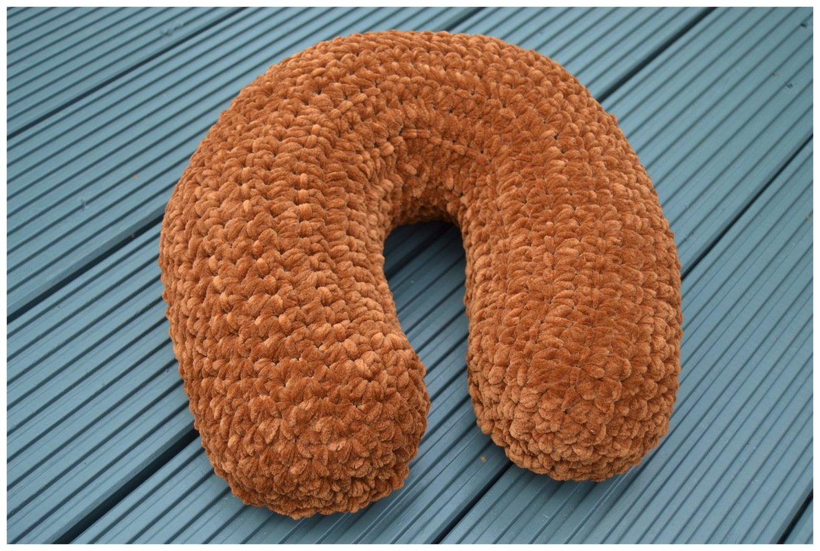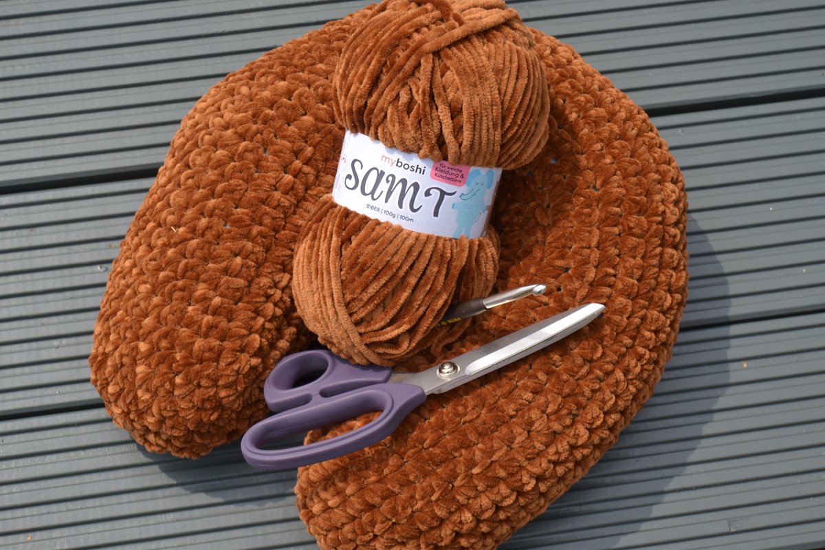 Ich liebe Nackenkissen. Vor allem nach meinen längeren Häkelabenden hab ich gern eins zum Entspannen und Entlasten meines Kopfes. Leider habe ich einfach keine Anleitung dazu gefunden um eines selbst zu häkeln, deshalb habe ich etwas getüftelt und verschiedene Garne probiert. Mit dem neuen flauschigen Samt von myboshi ist nun dieses tolle Nackenkissen entstanden.