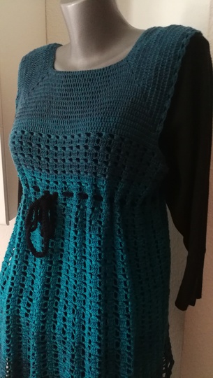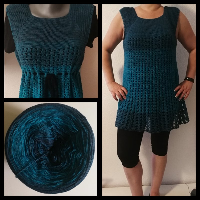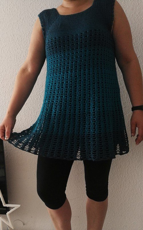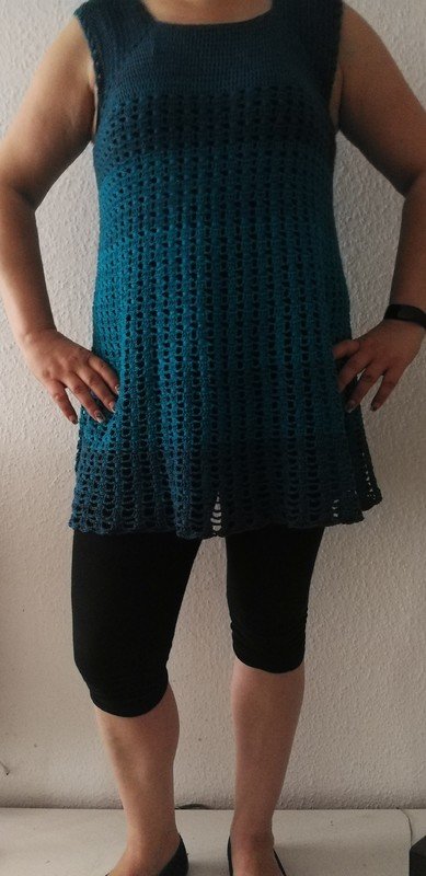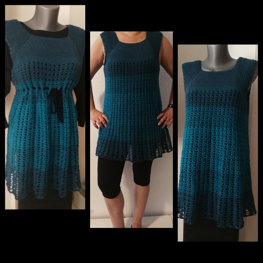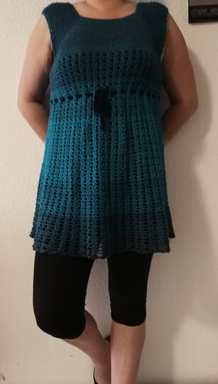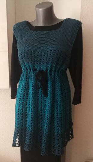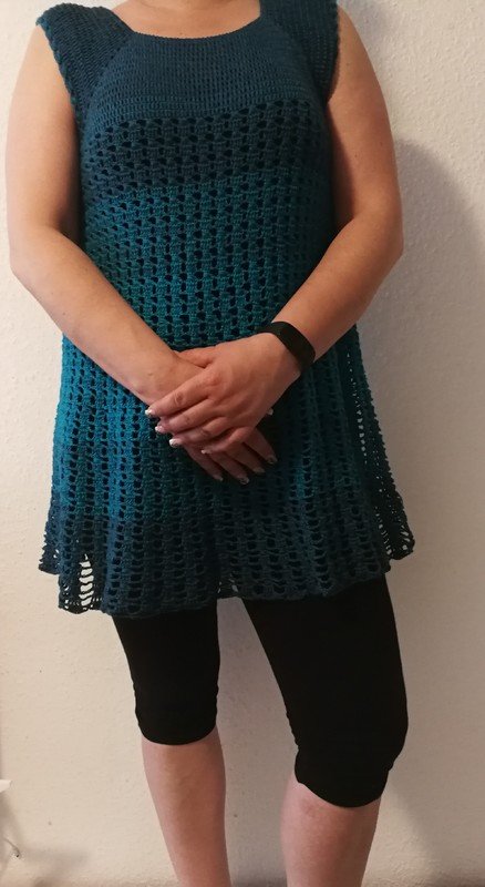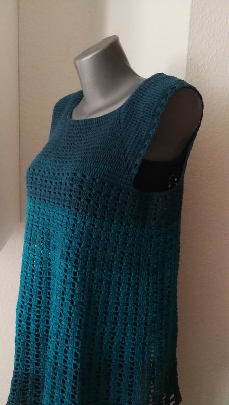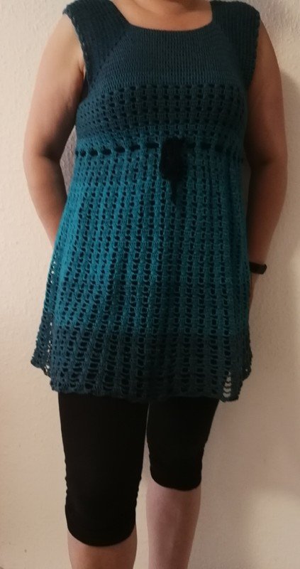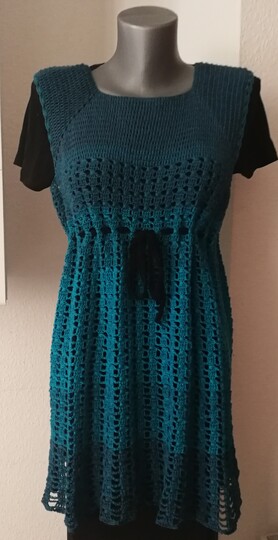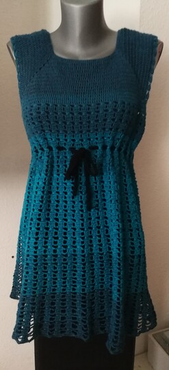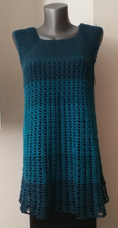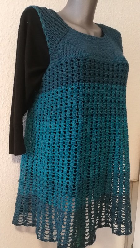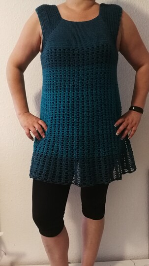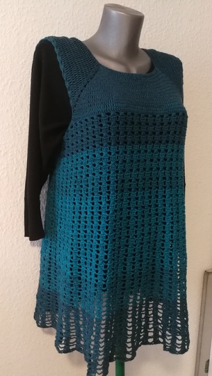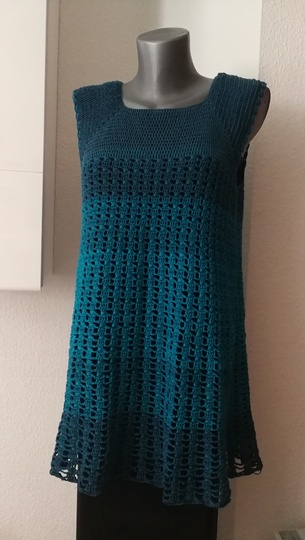 Eine Tunika nach dem RVO-Prinzip, sie wird von oben nach unten gearbeitet. Verbrauch für Gr.40/42 ca. 1400 m/ll, für kleinere oder größere Größen ca. 200 m/ll weniger oder ca. 200 m/ll mehr. wiederkehrendes Muster