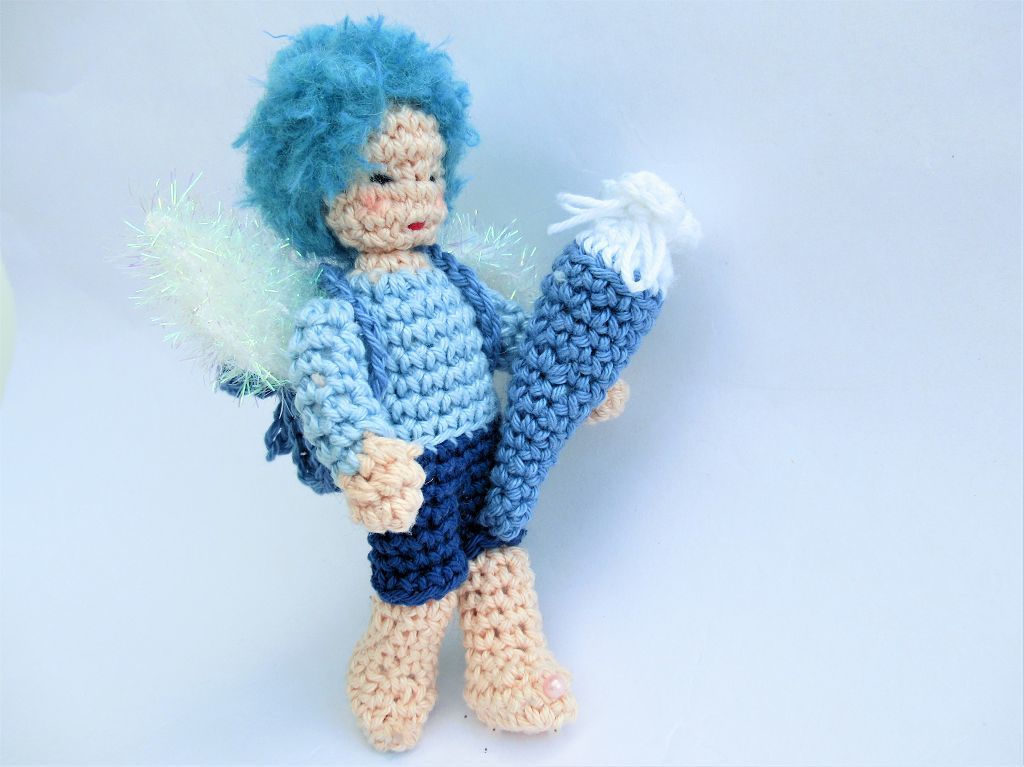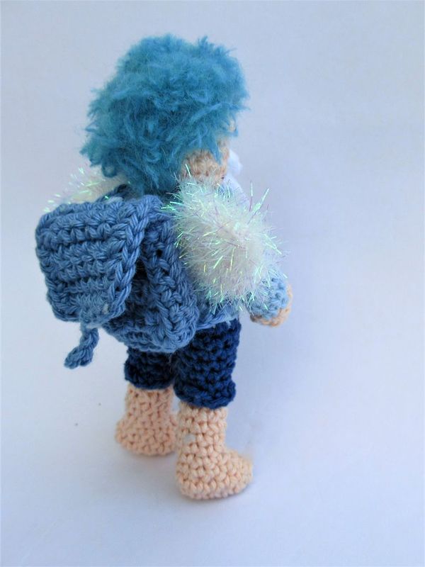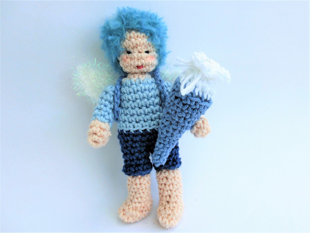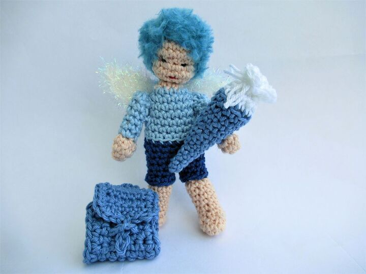 Ein kleiner Schutzengel für den Schulanfänger: kein entrücktes himmlisches Wesen, sondern ein frecher Lausbub wie das Schulkind! Barfuß, den Schulranzen auf dem Rücken und die Schultüte im Arm, kennt er die Sorgen und Nöte des Schulkinds genau. Dass er nicht ganz von dieser Welt ist erkennt man nur an den Flügeln und der außergewöhnlichen Haarfarbe. Er weiß, wie schwer es manchmal ist, den Erwartungen der Erwachsenen zu entsprechen und so begleitet er, am Schulranzen baumelnd, das frischgebackenen Schulkind und kann es trösten und beschützen.