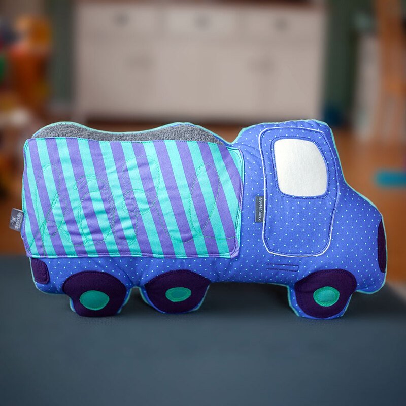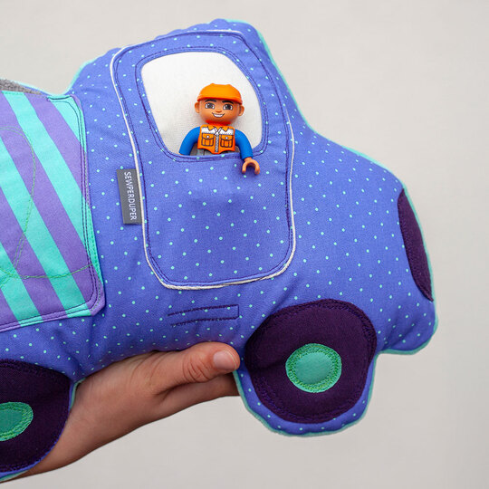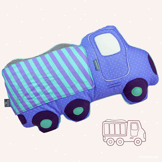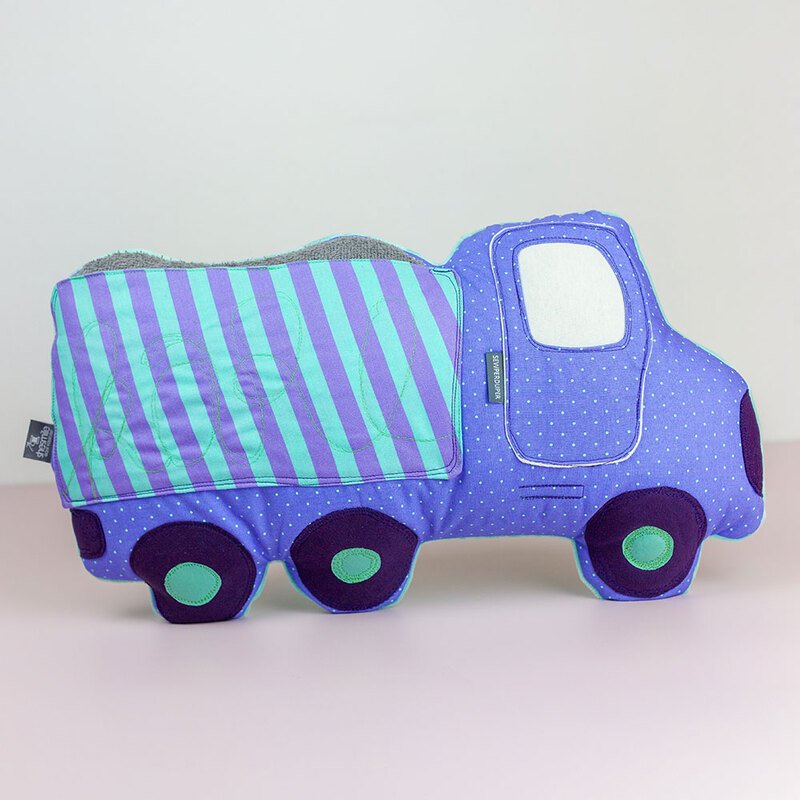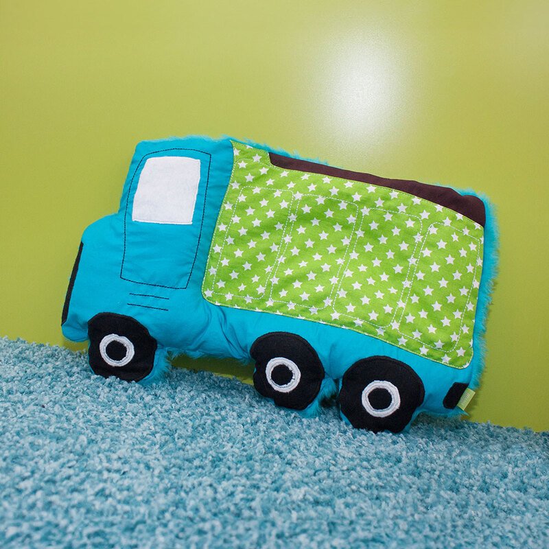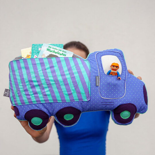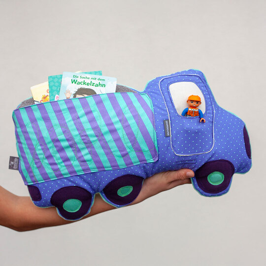 Nähanleitung und Schnittmuster gestaltet als PDF-E-Book für ein Kipplaster-Kuschelkissen, dass auch als Spieluhr genäht werden kann.