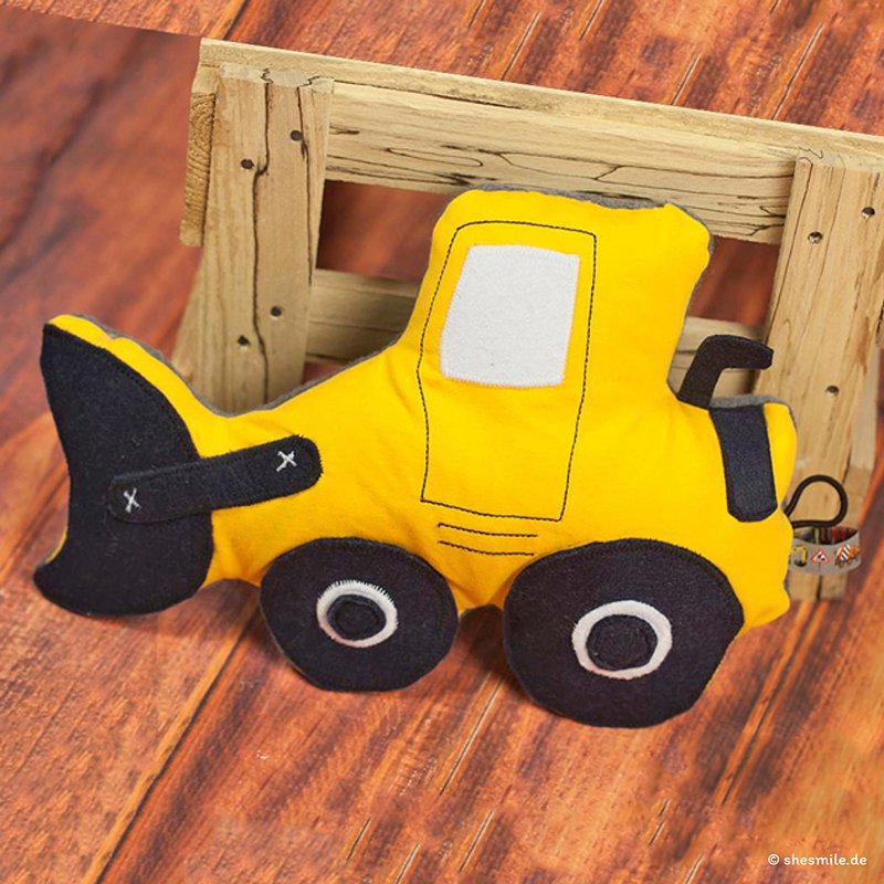 Nähanleitung und Schnittmuster gestaltet als PDF-E-Book für ein Radlader-Kuschelkissen, dass auch als Spieluhr genäht werden kann. Unwissende würden ihn auch Bagger nennen.