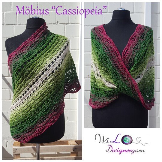 Für den abgebildeten Möbius habe ich 250 g "Palmenherz" 4-fädig von WiLo Designergarn mit Nadelstärke 4 verarbeitet.