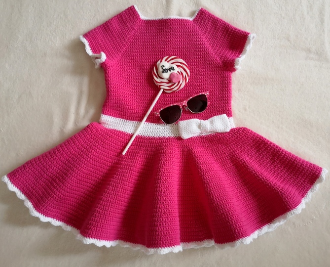 Das abgebildete Kleidchen, was als RVO gearbeitet wird, entspricht der Kindergröße 98/104. Es kann aber auch für andere Größen gehäkelt werden. Eine Kindergrößen-Tabelle sowie eine RVO Tabelle ist in der Anleitung enthalten.