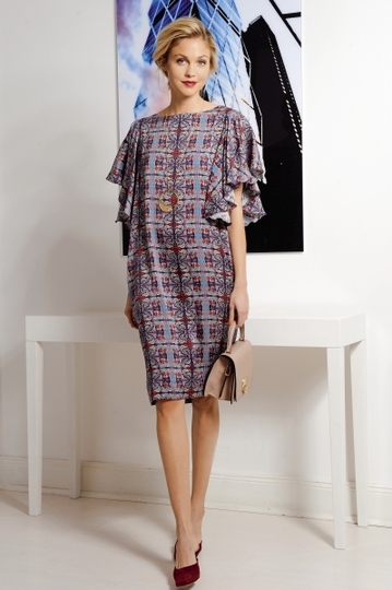 In der Schlichtheit liegt die Rafinesse. Der Schnitt, ganz gerade und mit leicht gerundetem U-Boot-Ausschnitt, wird durch den Teller-Ärmel perfekt in Szene gesetzt. Die Seide, ein ganz außergewöhnlicher Stoff, bei deren Gewinnung das Leben der Raupe gerettet wird, hat einen besonders schönen LibellenDruck.