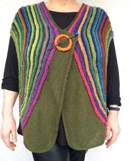 Die Weste passt für die Größen 46 bis 50. Sie lässt sich auch sehr einfach auf die benötigte Größe anpassen. Dazu musst du nur die Kreise größer oder kleiner stricken. Auch über die seitlichen Einsätze kannst du die Größe variieren, und die hintere Länge bestimmst du über die Form des Saums. Die angegebene Garnmenge reicht für die Weste, wie sie in den Fotos abgebildet ist, also mit Seiteneinsätzen und abgerundetem Saum.