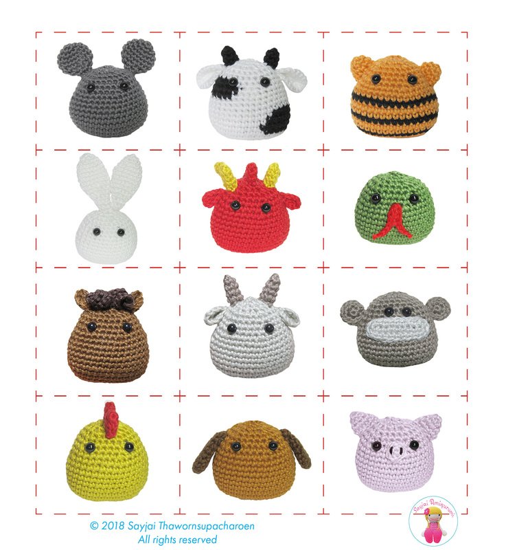 Einfaches Häkelmuster, um kleine Tiere für jedes Geburtsjahr zu kreieren: Ratte, Ochse, Tiger, Kaninchen, Drache, Schlange, Pferd, Ziege, Affe, Hahn, Hund und Schwein.