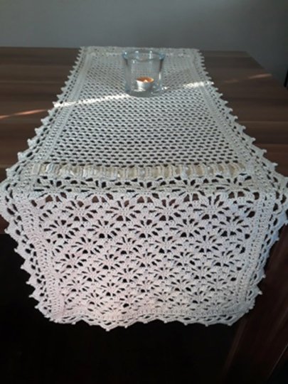 Ein schöner, stilvoller und zeitloser Tischläufer. Er ist ca 130x40 cm groß und kann jeder Größe angepasst werden.