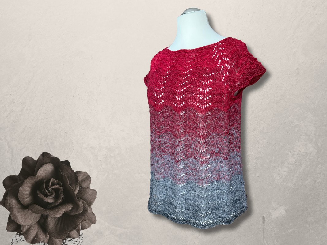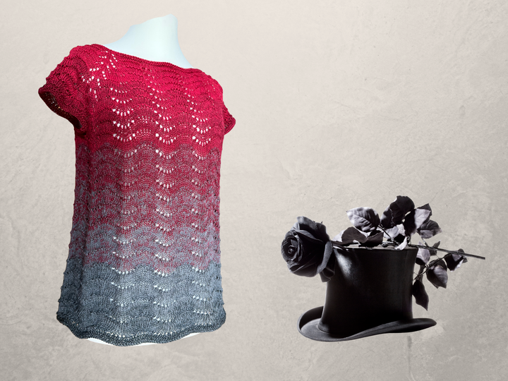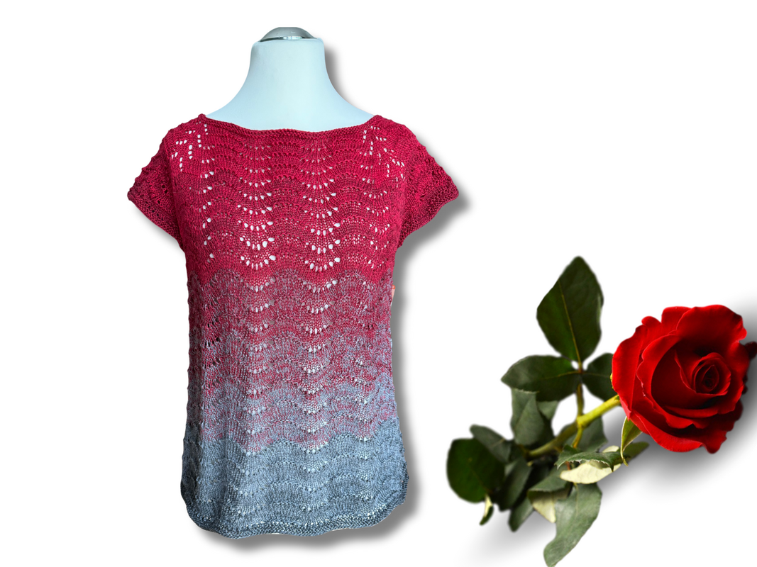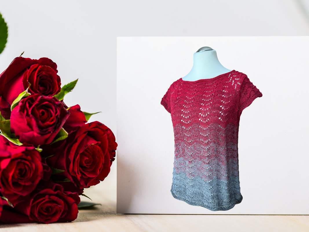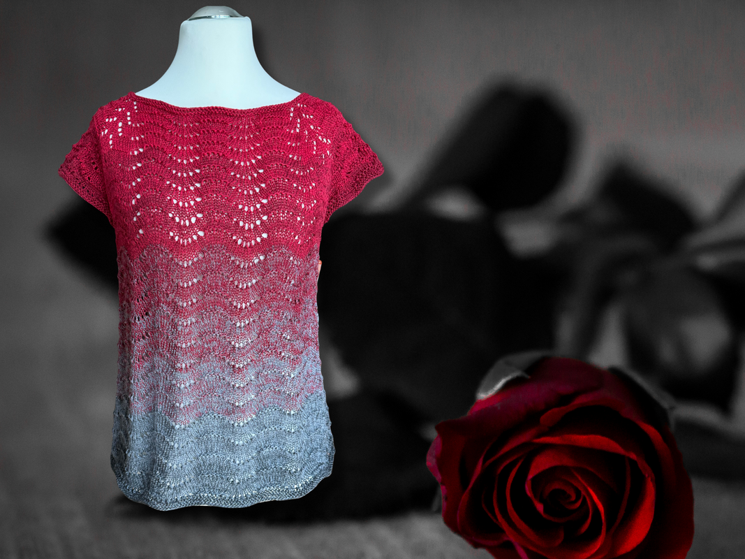 Diese Tunika wird in Runden von oben nach unten gestrickt. Die Raglanlinien fügen sich sich fast unauffälig in das Wellenmuster ein, das an das Aufblühen einer Rose erinnert.
