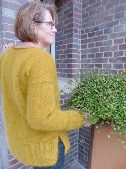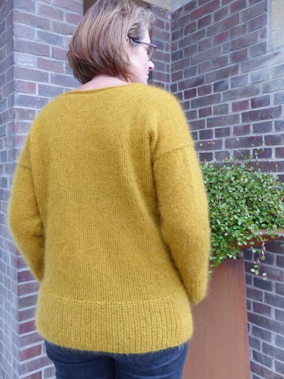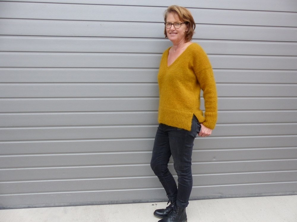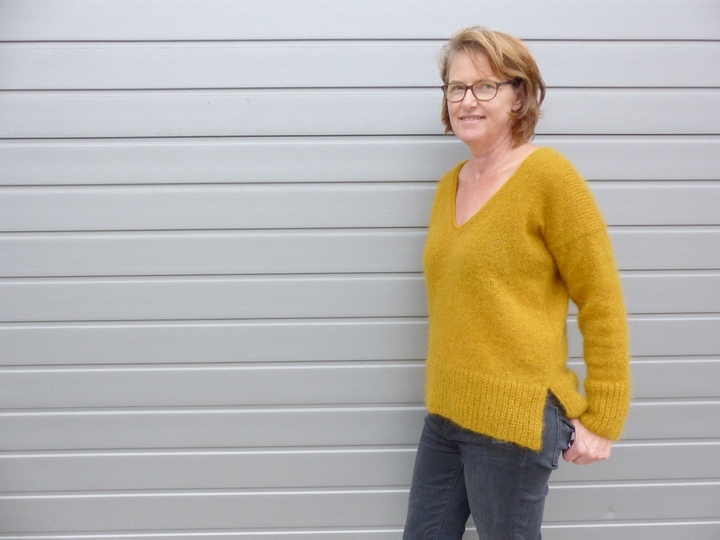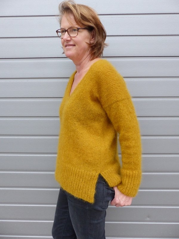 Er wird komplett mit zwei Fäden gestrickt und hat einen tiefen V-Ausschnitt. Die unteren Bündchen am Pullover bleiben offen, dadurch entstehen die Schlitze und somit der lässige Look.