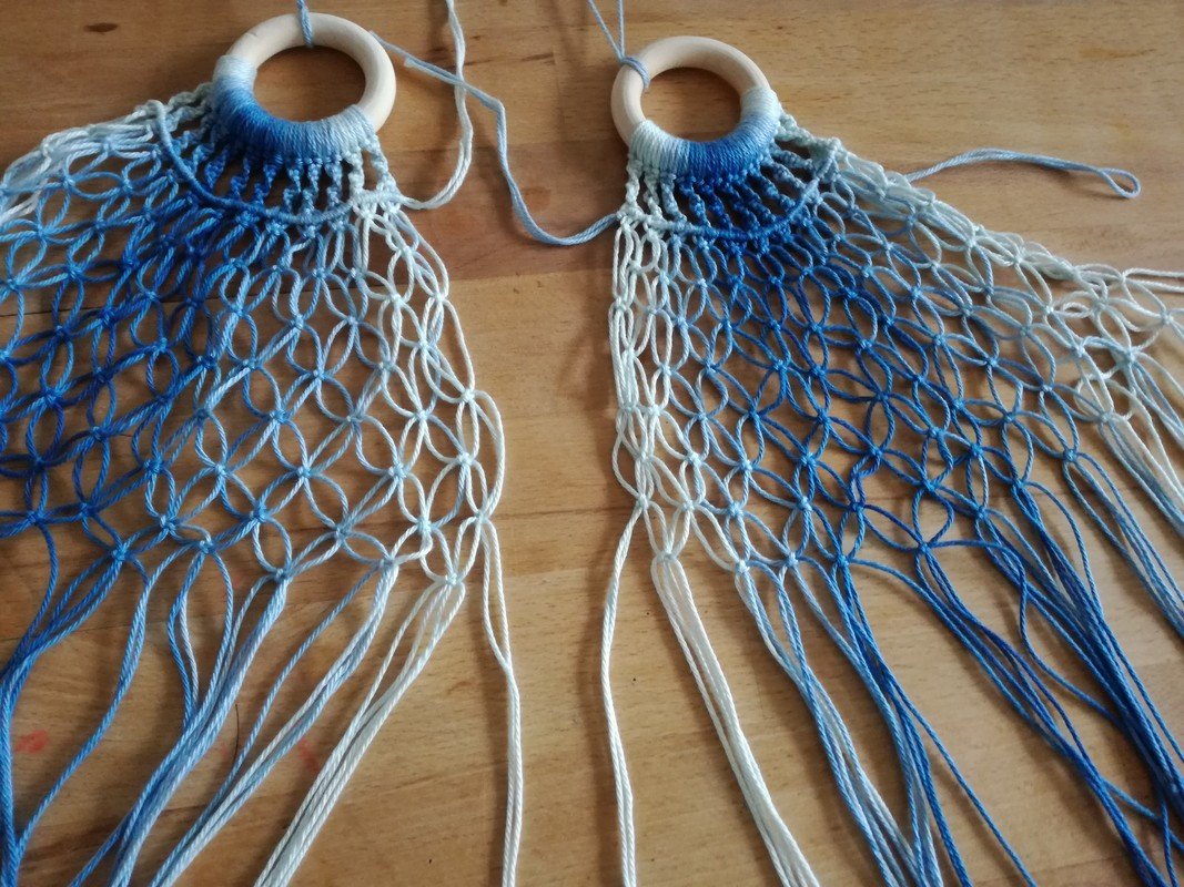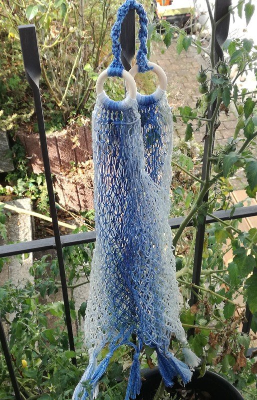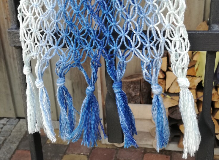 Die Makramee Technik habe ich durch eine liebe Kundin neu für mich entdeckt. Sie ist toll geeignet auch für Nicht- Stricker und - Häkler. Außer der Wolle werden kaum Hilfsmittel benötigt, es wird einfach mit den Händen geknotet. Und den Look der sich kreieren lässt ist einfach klasse, die Möglichkeiten vielfältig.