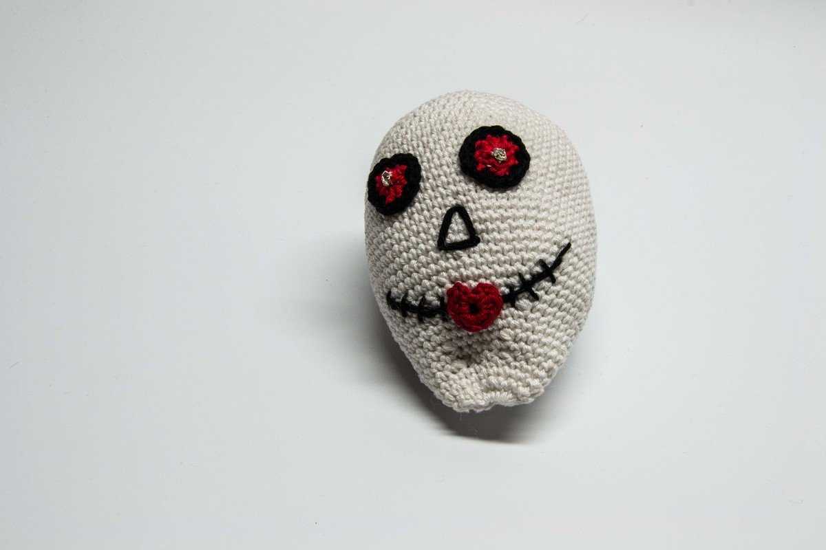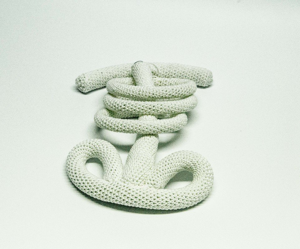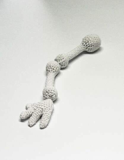 Aus 100% Baumwolle gehäkelt, die Knochen werden innen mit Draht und Schläuchen verstärkt, und z.T. mit Füllwatte ausgestopft.