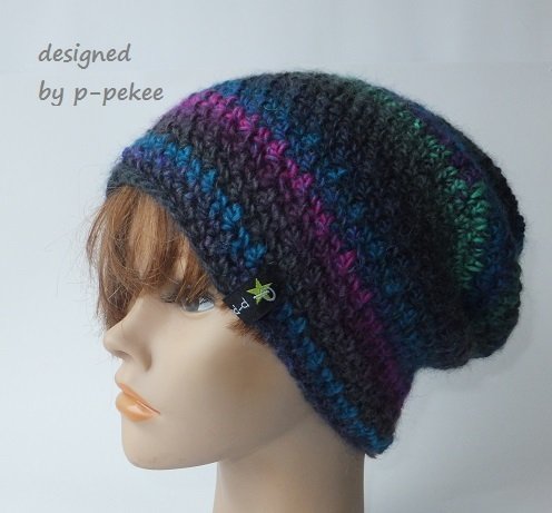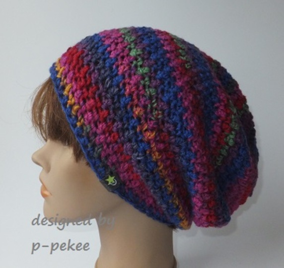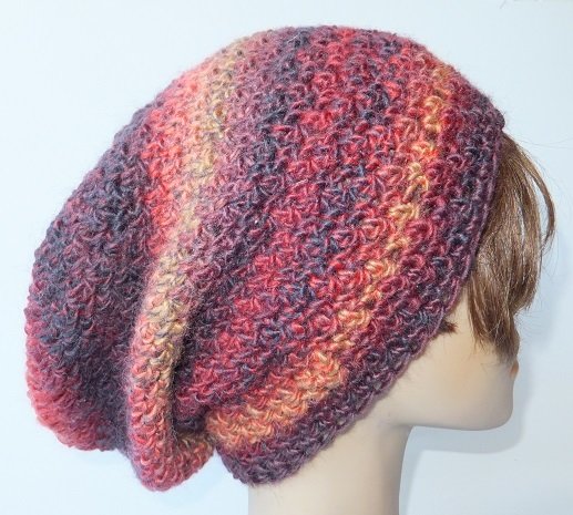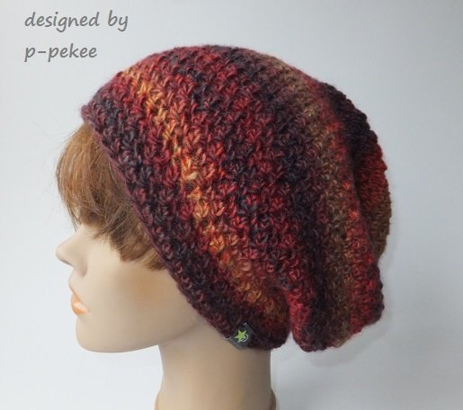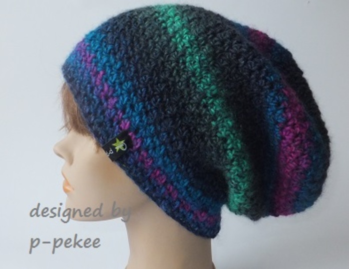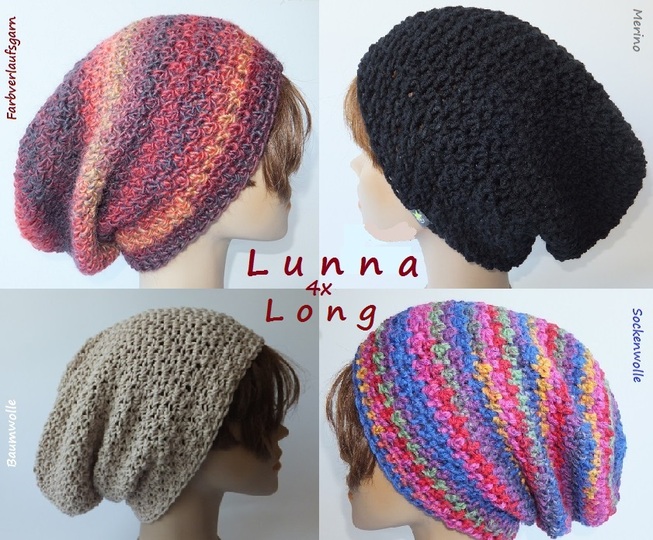 Bei den vier Mützen handelt es sich immer um die gleiche Mütze. Sie wurde nur mit verschiedenen Wollarten gehäkelt.