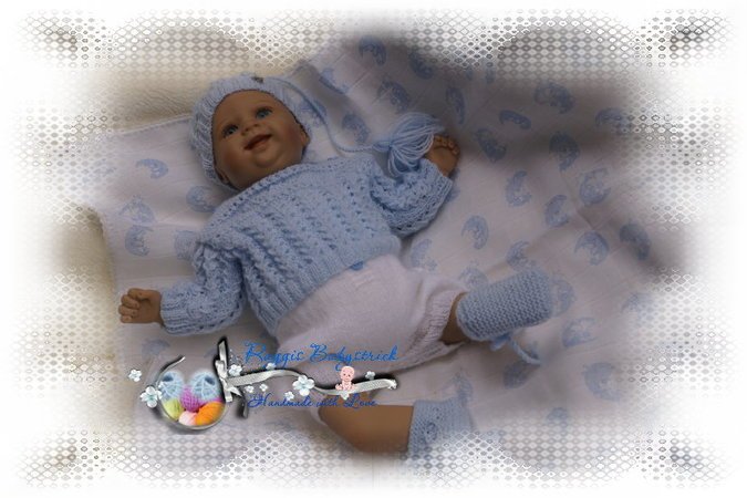 Strickanleitung für ein wunderschönes Set, 3-teilig für Babys & Reborns, Gr. 50/56 Das Set ist aus Babysoftwolle Nd. - Nr. 3 gestrickt. Die Anleitung ist sehr genau beschrieben und mit vielen Fotos. Auch ohne viel Strickerfahrung kannst Du mit dieser Schritt – für – Schritt – Anleitung diese Set leicht nacharbeiten.