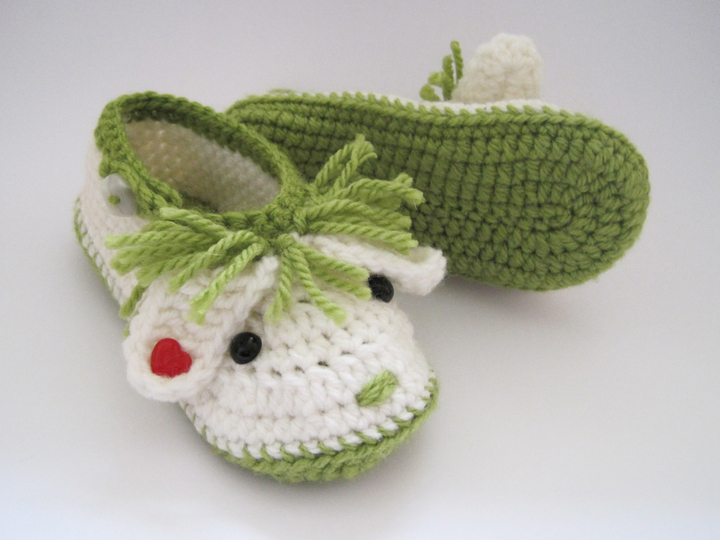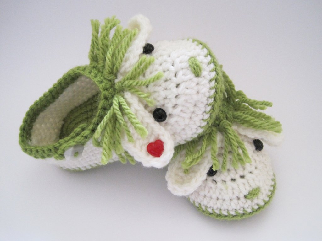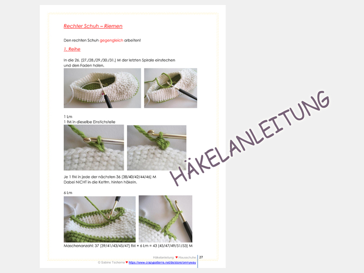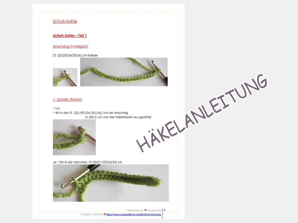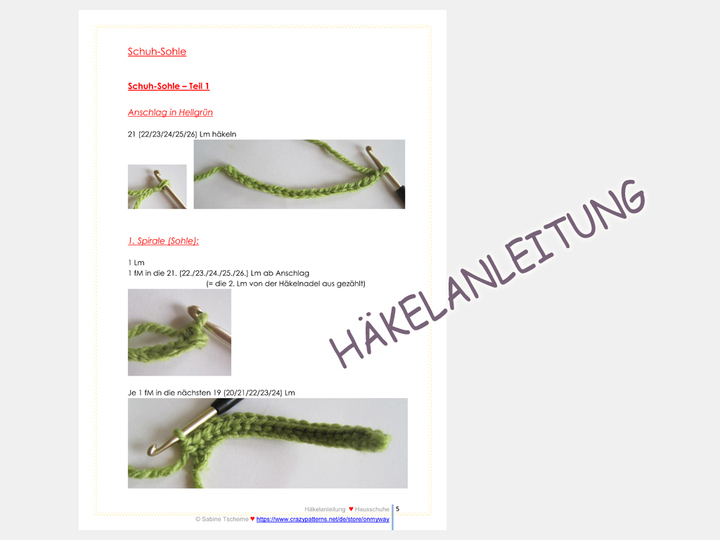 Alle Arbeitsschritte und Häkelmaschen werden in der Häkelanleitung genau erklärt und mit vielen Abbildungen veranschaulicht. Die Schuhsohle wird doppelt gehäkelt.