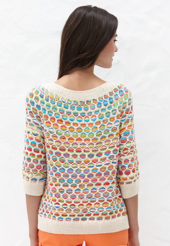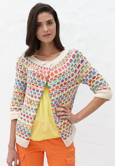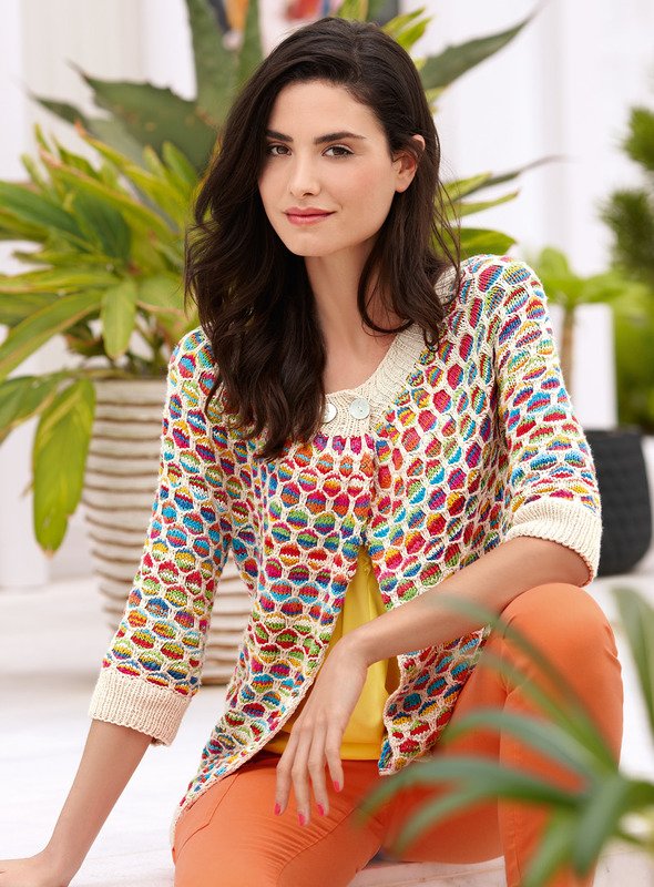 Wie "ein Mosaik aus vielen bunten Steinen" ist die Inspiration bei dieser Jacke. Für den Eyecatcher-Effekt sorgen die farbenfröhlichen Multicolorgarne und das Wabenmuster.