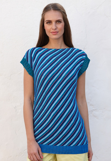 Querstreifen in leuchtenden Blautönen verschaffen dem Stricktop und seiner Trägerin eine starke Präsenz. Wir finden: das perfekte Basic zum Start in die warme Frühlings-Saison!