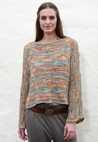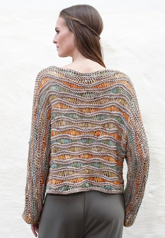 Das perfekte Basic für die Übergangszeit: der dreifarbige Streifenpulli in einem Stück gestrickt. Für die Transparenz im Muster sind Fallmaschen zuständig. Lässiges Teil!