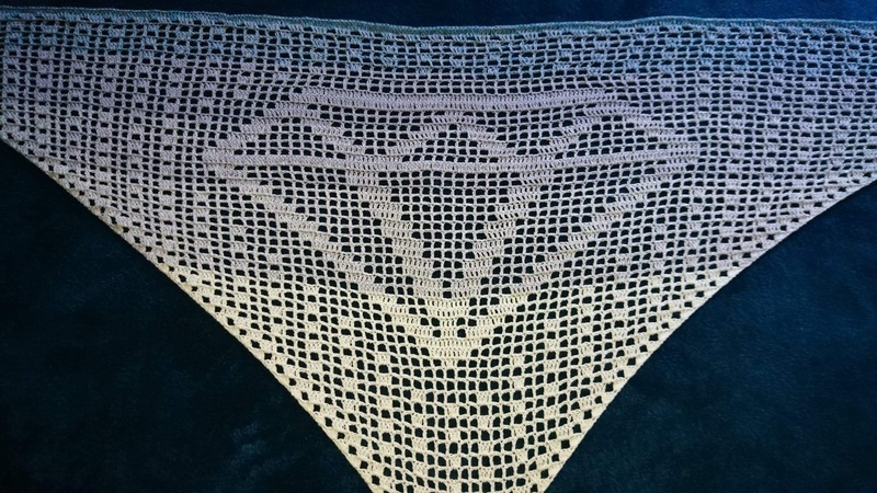 Die Anleitung ist auf 4 Seiten in teilweise Schrift (Erklärung Filethäkeln), der Anfang des Tuches in Pc-Häkelschrift und Zählraster geschrieben.