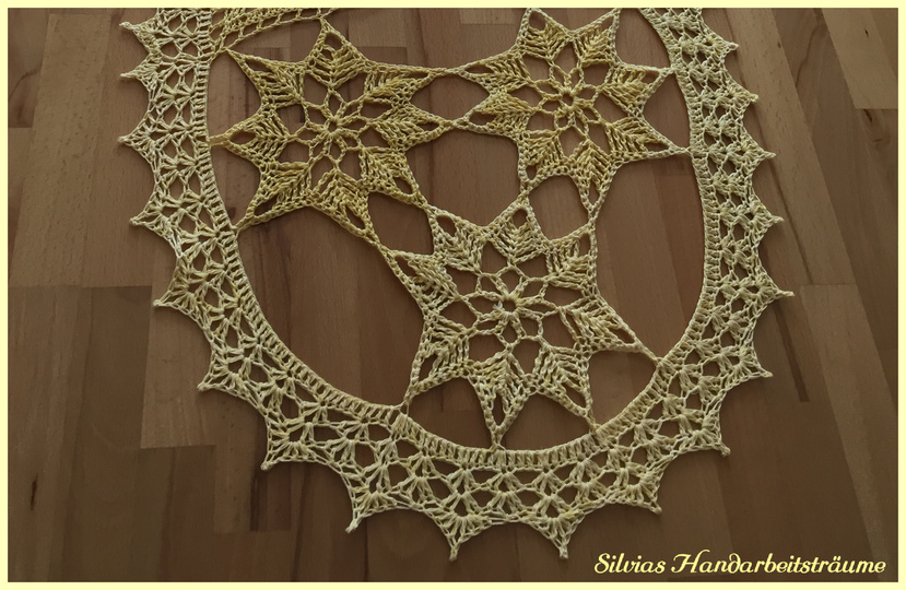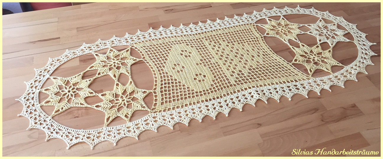 Ein schöner Tischläufer im Filetmuster mit Sternen an den Enden zu Weihnachten.