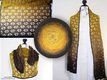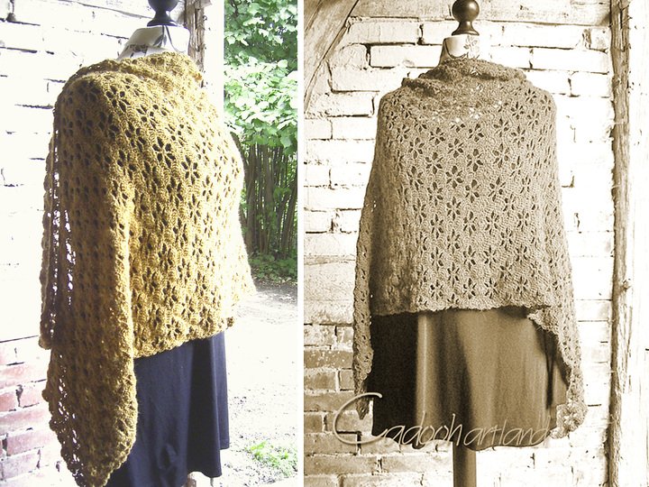Dunkles Maisgelb/Curry/Senf. Entdecke die kargen Blumen in den gehäkelten Lochblüten.