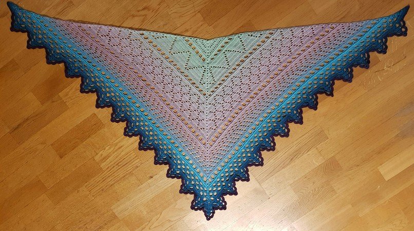 Für das Tuch werden 1000m eines 3fädigem Farbverlaufsgarns benötigt. Ihr könnt natürlich auch jedes andere Garn nutzen, dass euch gefällt, allerdings kann ich da nichts zum Verbrauch sagen.