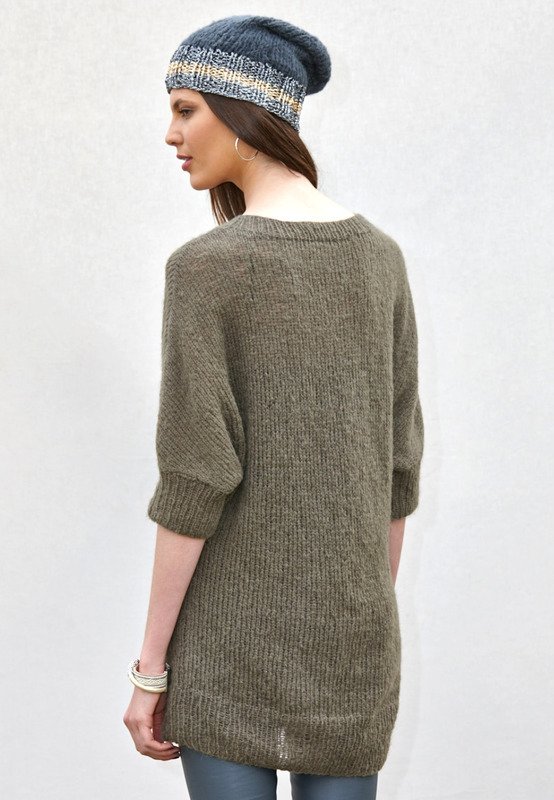 Pullover: LANGYARNS "Alpaca superlight" (54% Alpaka, 24% Polyamid, 22% Schurwolle, LL ca 199 m/25 g): ca 200 (225-250-275) g Braun Fb 0099; addi-Stricknd 4,5 und 5 mm; addi-Rundstricknd 4,5 mm, 40 cm lang. Mütze: LANGYARNS "Alapaca superlight": ca 50 g Anthrazit Fb 0040 und "Lame" (60% Polyamid, 40% Polyester, LL ca 85 m/25 g): je ca 25 g Aluminium Fb 0224, Gold Fb 0222 und Silber-Schwarz Fb 0223; addi-Spielstricknd 8 und 9 mm.