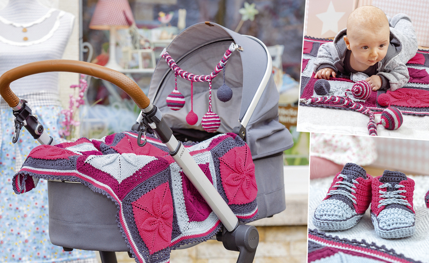 Die hübschen Baby-Turnschuhe, das gehäkelte Babyspielzeug und die farbenfrohe, in einem attraktiven Blättermuster gestrickte Krabbeldecke machen den Herbst-Spaziergang mit Baby oder
