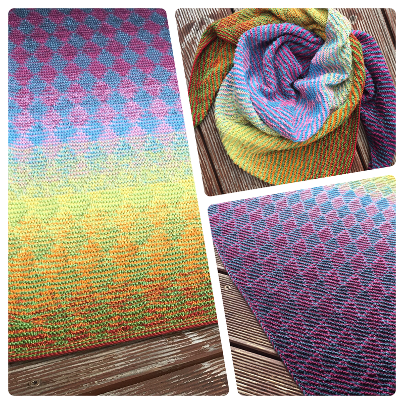 Das Tuch Shadow of Diamonds wurde aus zwei Wollbobbel, Melonberry und Sunset over the Ocean, gestrickt. Dafür haben wir 4 Fach Garn mit je 500 Metern Lauflänge verwendet. Das ergibt eine Maße von ca. 170 x 120 x 110