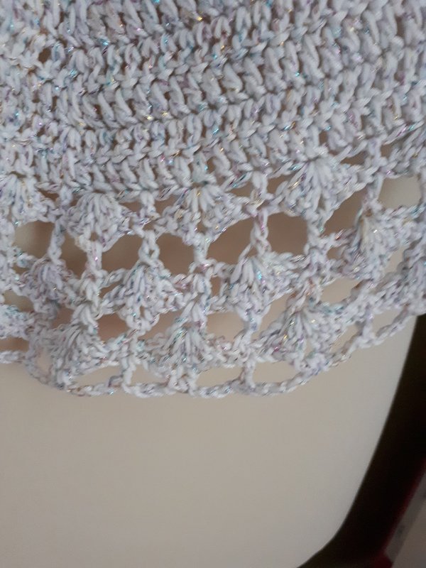 Ohne Musterkante besteht das Shirt nur aus Stäbchen. Für die Musterkante werden Luftmaschen, feste Maschen und Stäbchen benötigt.