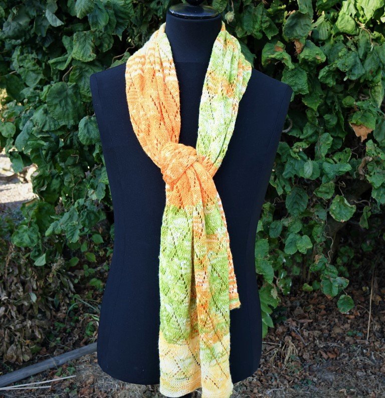 Und so ist es dann auch umgesetzt worden. Die 3 Knäuel wurden beliebig nach Laune beim Farbwechsel verstrickt und das Rautenmuster ist einfach und fernseh- und bahntauglich.