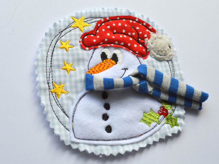 Durch Unterlegen verschieden bunten Stoffe während des Stickvorganges erhaltet ihr einen süßen Schneemann in Doodle-Optik (Fransen-Look), einfach überstehenden Stoff während des Stickvorganges abschneiden. Die Maschine hält nach jeder Farbe/Durchgang, so kann der Rahmen aus der Stickmaschine genommen werden, um den überstehenden Stoff abzuschneiden und neuen Stoff aufzulegen.