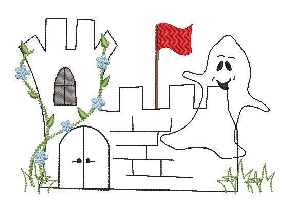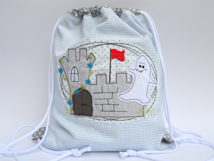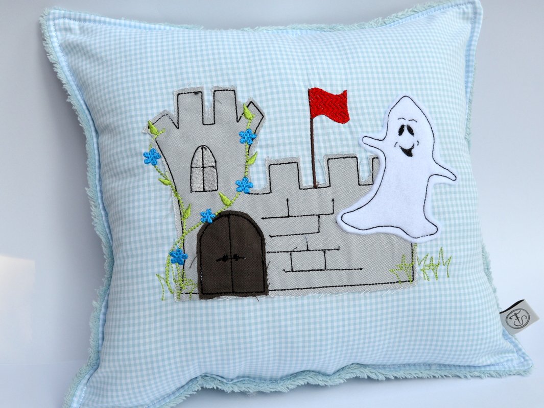 Mit wenigen Stichen können eigene Nähprojekte wie Taschen, Shirts, Kissen eine eigene Note verpasst werden!!! Burggespenst in Doodle Optik, das Stickbild wird mit Stoff unterlegt und in Fransen-Optik aufgestickt, nach dem Aufsticken außen herum im Abstand von 2-3mm abgeschnitten, restliche Stickereien mit Stepp-, Konturstiche.