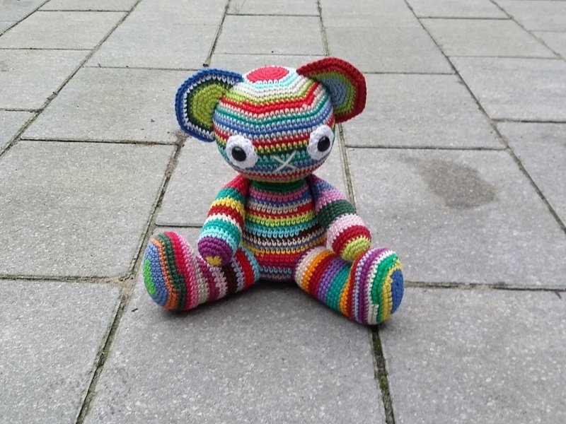 Diese Häkelanleitung beeinhaltet den extrem bunten Streifenteddy.
