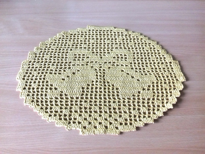 Das Platzdeckchen wurde mit einer Häkelnadel 3,0 und der Wolle Gründl Mango Creme, LL 130m / 50g (oder Drops love you 9 in Curry bzw. Creme) gearbeitet. Bei mir ist das Platzdeckchen 32 cm hoch und 42 cm breit.