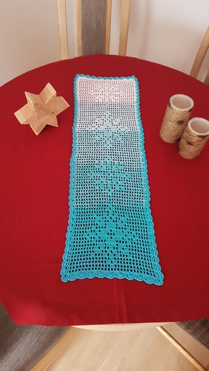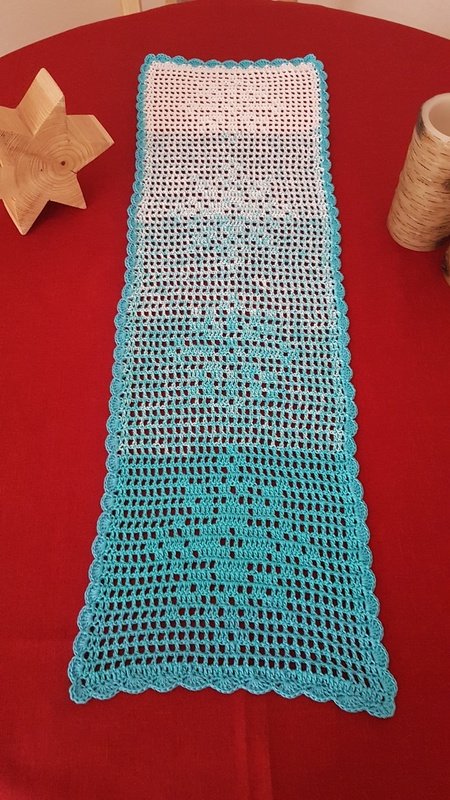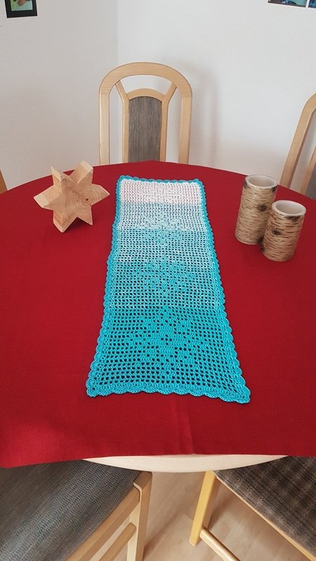 Genutzt wurde ein 4 fädiger Bobbel mit einer Lauflänge von 280 Meter und gehäkelt mit einer 3 er Häkelnadel, dann hat der Läufer die Maße 84x27 cm (bei 2 Mustersätzen, 1 Mustersatz mit Umrandung ca 130 m ll).
