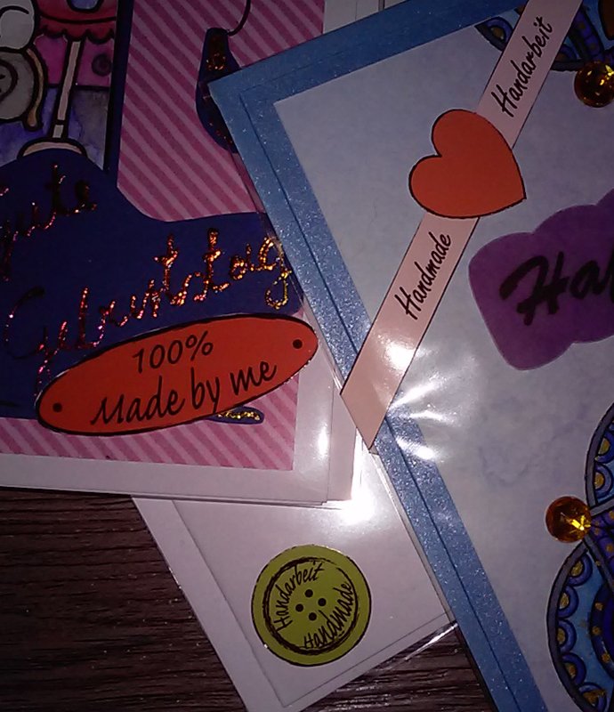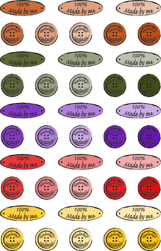 Zwei DinA4-Bogen mit Handarbeitslabeln. Kleine und große Knöpfe, ovale Plaketten und Banderolen mit Herzen.