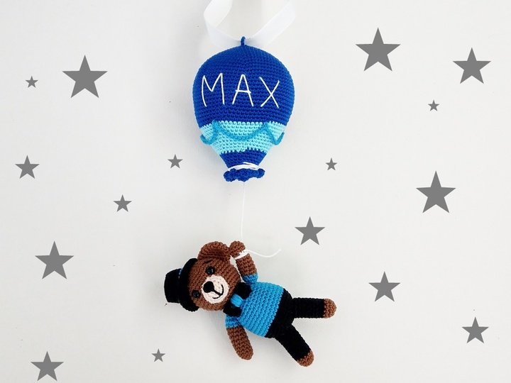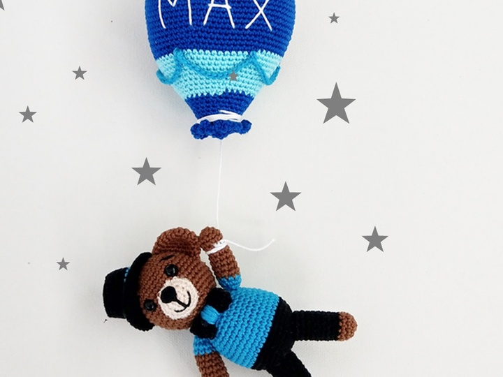 In seiner Hand hält das Bärchen ganz stolz und fest einen großen Luftballon