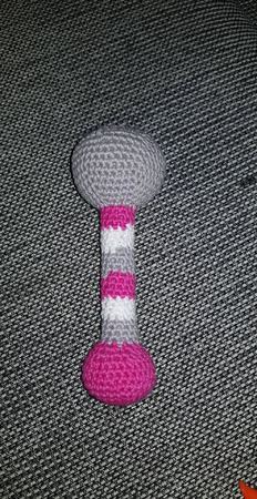 Das ist eine Häkelanleitung für eine ca 15 cm große Rassel.