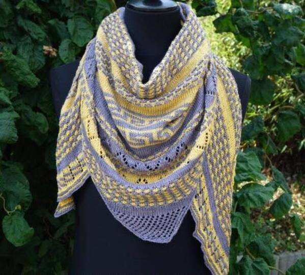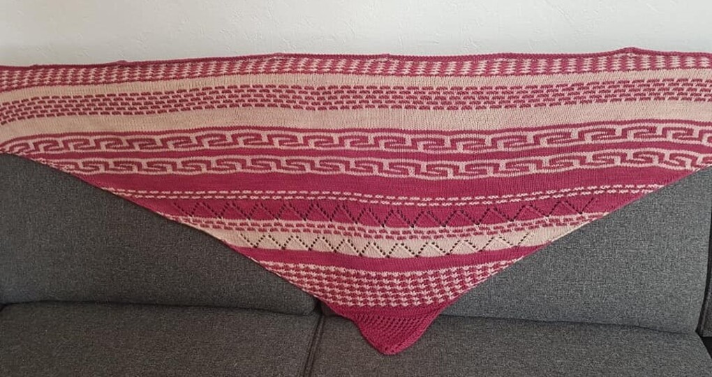 Das Original Tuch ist mit Silky Yak und Silky Merino von Rooster gestrickt. Einige Tester haben auch mit FMS gestrickt.