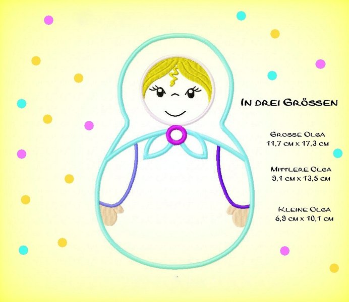 Zum Verschönern von Kinderkleidung, Taschen, Kissen und und und. Für die große und mittlere Olga-Applikation wird ein Rahmen mit 13 cm x 18 cm benötigt. Die kleine Olga kann mit einer Rahmengröße von 10 cm x 10 cm gestickt werden. Anleitung deutsch.